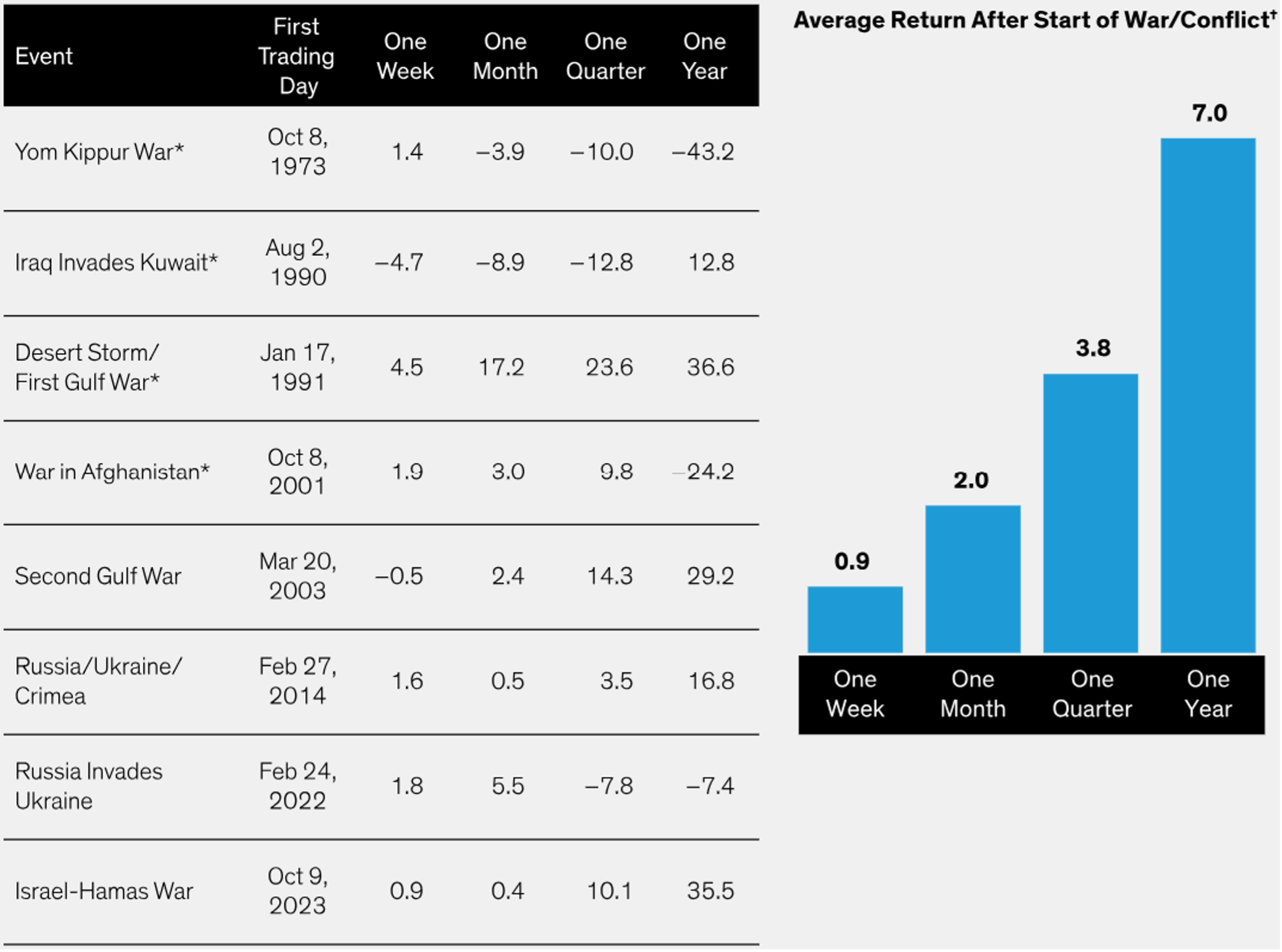 AllianceBernstein provides additional perspective, showing that wars over the past 50 years have generally not had a lasting negative impact on equity markets. In fact, the data suggests that the S&P 500 has delivered an average one-year return of approximately 7% following major geopolitical conflicts.