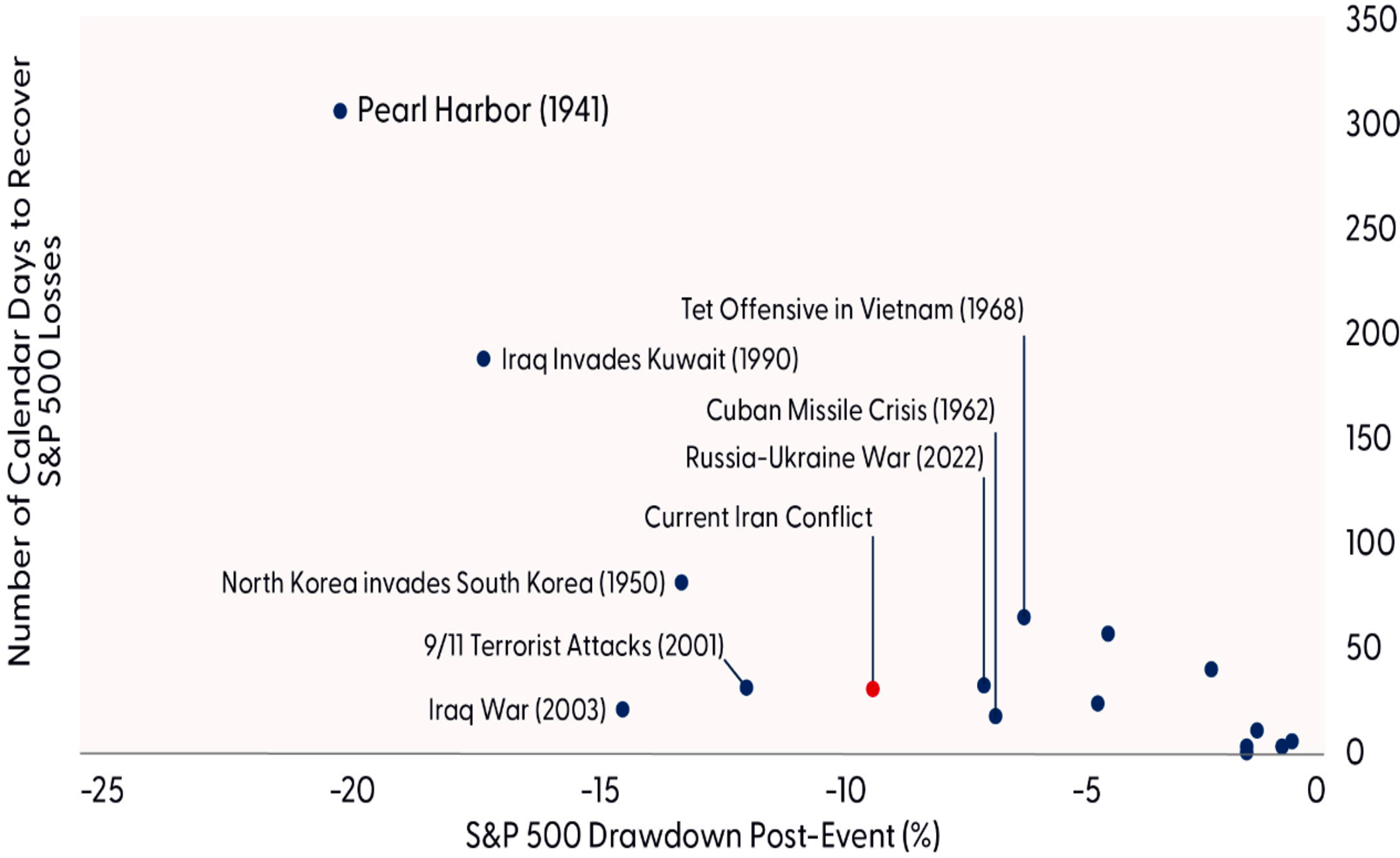 Prior to the outbreak of hostilities, the S&P 500 Index stood at 6,878.88. Over the following 30 days, the index declined 7.8%, falling to 6,343.72 by March 30, 2026. Yet, just as quickly as the market fell, it rebounded – recovering to 6,886.24 by April 13. This marked a full recovery within just two weeks of the low and only 44 days after the initial event.¹