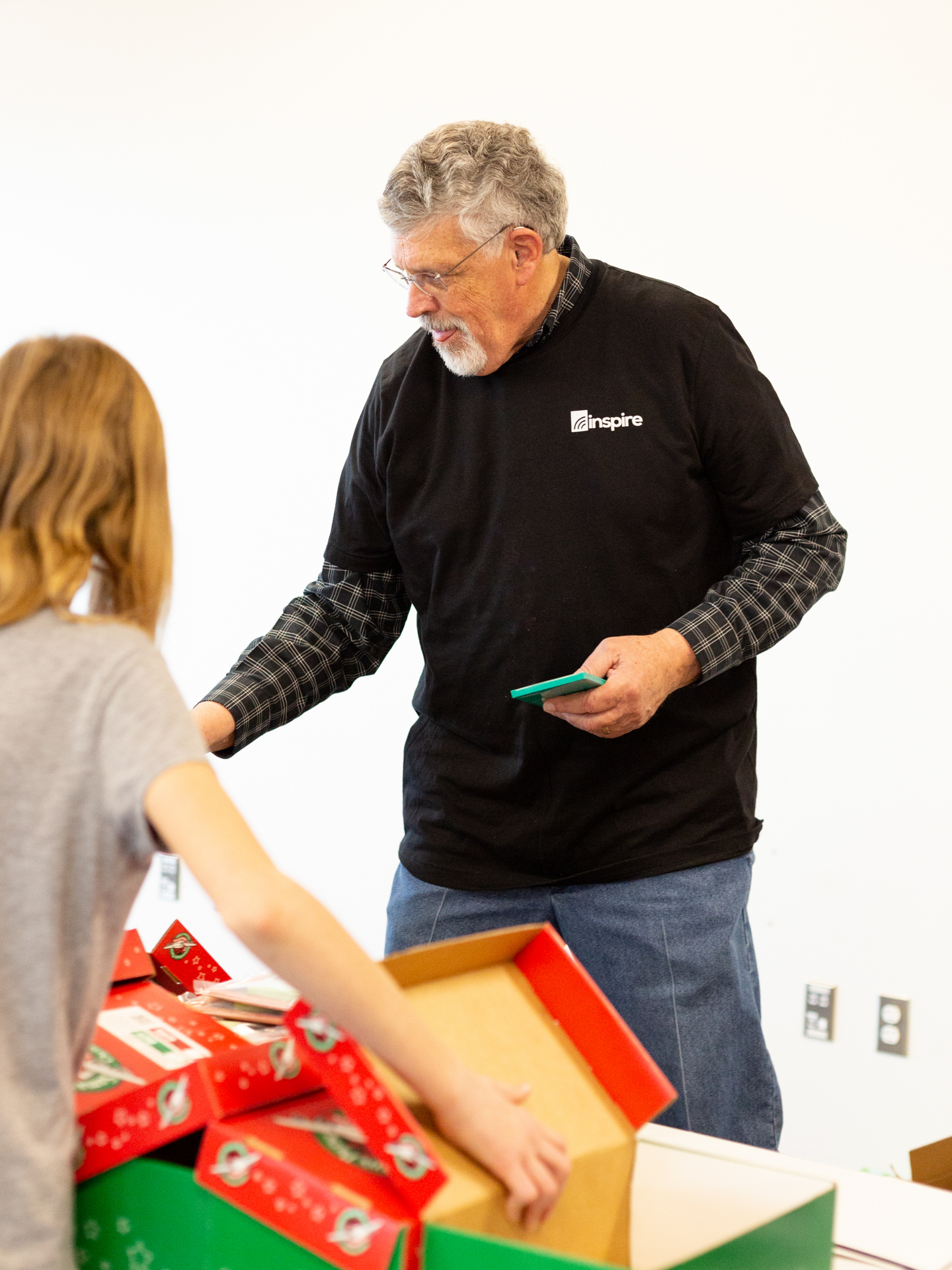 Since 2009 more than 26.5 million children have heard the saving gospel message of Jesus Christ through Samaritan Purse’s 12-week children’s discipleship program called The Greatest Journey. Through their partnership with local churches, these children learn from trained, local volunteers about what it means to be a follower of Jesus and share their faith with friends and family. Inspire’s CEO, Robert Netzly, was able to begin the spiritual journey of these boxes by sharing the true meaning of Christmas with the families of Inspire, and together we were able to pray over each of the children who will receive a box.